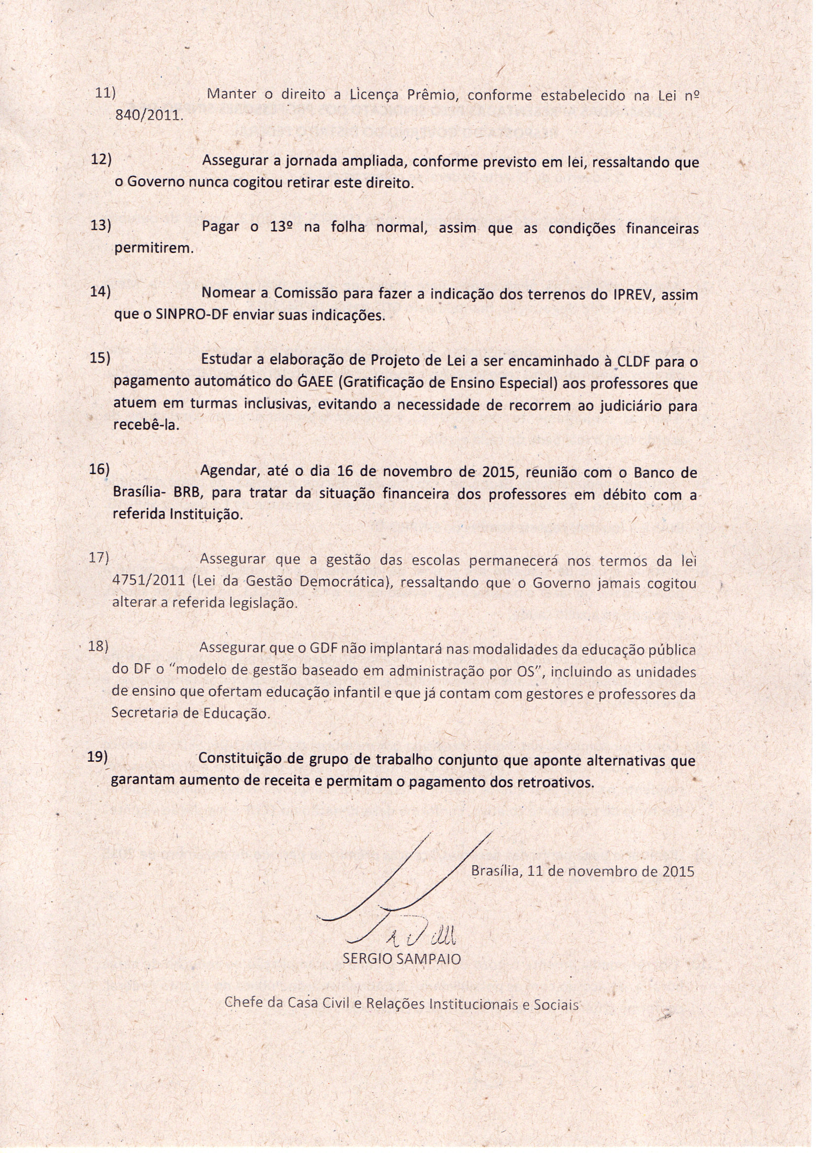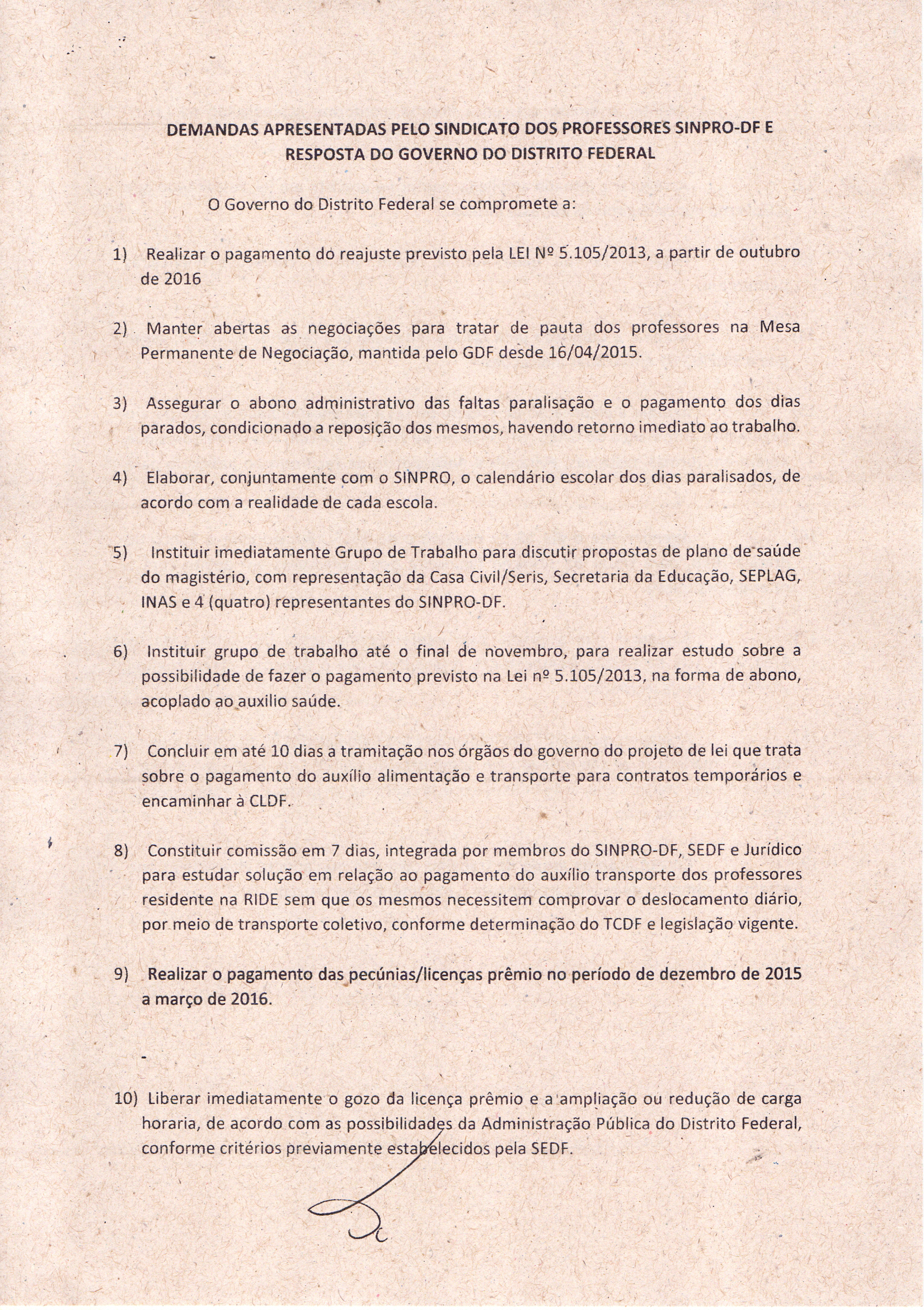 A luta dos(as) professores(as) fez o governo recuar de diversos ataques contra a categoria e foi a partir desta luta que nós garantimos pontos importantes. Dentre eles destacamos a rejeição do item número 1, que fala sobre o pagamento do reajuste salarial previsto a partir de outubro de 2016 – é importante salientar que este item voltará a ser discutido pela categoria na Campanha Salarial de 2016; a manutenção da jornada ampliada; a manutenção da licença-prêmio conforme está previsto na Lei Complementar nº 840; a certeza de que as Organizações Sociais (OS), que estão sendo implantadas na educação pública dos estados de Goiás e São Paulo, não atingirão as escolas do DF; que a Gestão Democrática, Lei nº 4.751/12, será mantida da forma como está hoje; e a proposta para a reposição dos dias parados sem desconto no salário do professor.